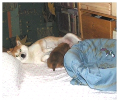 Frisch entwurmt, mit eingekürzten Krällchen startet die dritte Woche. Die Waage ächzt: 1054g. Die Augen sind nun richtig offen, Doyōbi-san wackelt auf seinen Beinchen schon ein bißchen herum. Das Schwänzchen wedelt, wenn seine Mama zu ihm kommt. In meinen Armen entspannt er sich schnell, protestiert kaum, läßt sich auch kraulen sehr gern gefallen.
