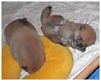 Die dritte WocheMit erstmaliger Entwurmung fängt Woche 3 an. Die beiden Hundekinder wiegen 948g (Fukudama) und 933g (Fusuke). Die Augen sind jetzt deutlich offen, aber die meiste Zeit doch noch fest geschlossen, denn die Schlafphasen überwiegen bei weitem.