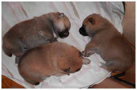Hinter dem Absperrgitter geht es munter zu. Auf kleinen Wackelbeinchen wird das Laufen geübt, hopsen kann man es auch nennen. Die Welpenzähne sind voll einsatzfähig und beim Naßfutter wird ordentlich reingehauen. Bummi säugt weiter ihre Welpen, aber die Abstände werden länger und die Geduld der Mutter kleiner. Dankbar nimmt Bummi den sicheren oberen Liegeplatz auf der Wurfhöhle an. Das Fußvolk unten balgt sich, quietscht auch mal, wenn es zu heftig war, schlummert aneinandergekuschelt. Die Krallen wurden erneut geschnitten, auch die Entwurmung war Ende der Woche wieder dran. Die Waage zeigt an: Genji 1606g, Genroki 1301g, Garuma 1457g. Es geht voran!