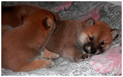 Die Welpen erobern mehr und mehr ihr Revier. Das Absperrgitter steht meist offen, und unter Aufsicht wird alles beknabbert oder rumgeschleppt. Zum Schlafen zieht sich besonders Genroki gern in die Kuschelhöhle zurück, er ist überhaupt ein Höhlenforscher - alle Winkel und Nischen werden von ihm ausgiebig getestet. Genji liebt die Plüschtiere, spielt auch allein ausdauernd damit und ist bei den Kampfspielen der Brüder eher gemütlich. Garuma tut überall mit, wo was los ist. Wenn die Großen ihn mal anmotzen, macht er sich meist nichts draus. Er ist der drahtigste der drei. Alle Welpen lassen sich gern von mir anfassen, hochnehmen und schmusen eifrig mit. Muttermilch und Welpenkost gibt es regelmäßig in Abständen, beides wird gern genommen. Deshalb ist der Trend der Waage weiter nach oben gerichtet - am Ende dieser Woche sieht es wie folgt aus: Genji 2105g, Genroki 1767g, Garuma 1904g. Bald gehts raus!