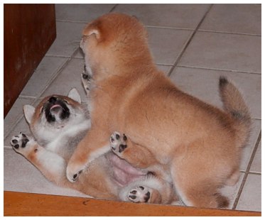 Hoshimi und Hiroshi entwickeln sich weiter gut. An das ausschließliche Trockenfutter haben sie sich schnell gewöhnt. Nachts wird gut durchgeschlafen, wenn keine Ablenkung eintritt. Dann ist aber Radau angesagt! Hinter der Absperrung bleiben die beiden tagsüber meist nur ohne Protest, wenn sie müde sind. Bummi kann nach Belieben zu ihren Kindern hineingelangen, doch darauf hat auch sie meist keine Lust mehr. Für das Rumkaspern ist vor allem Paia zuständig, sie macht das ganz großartig.